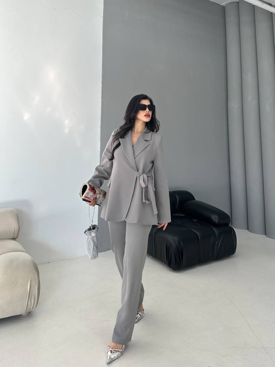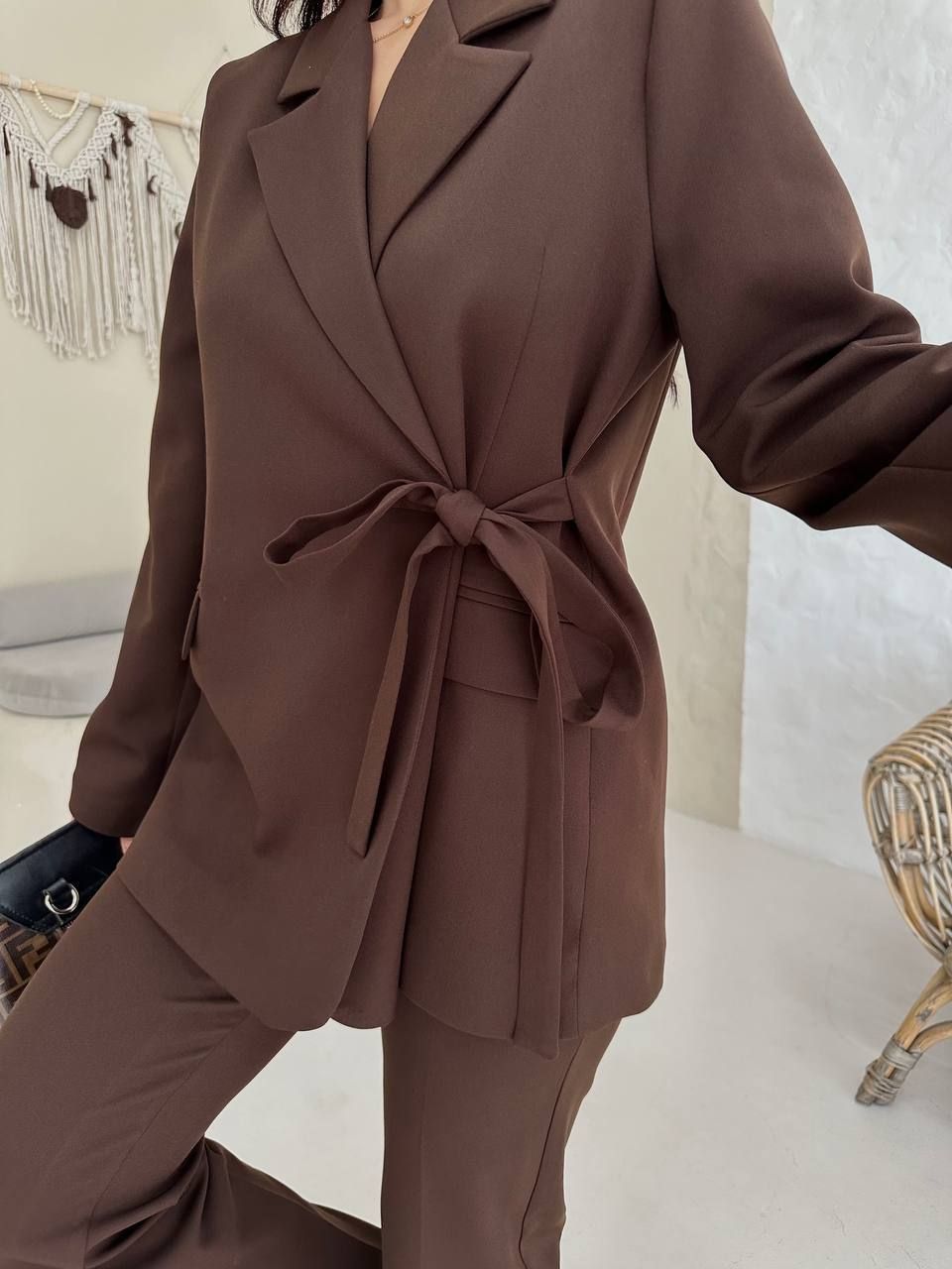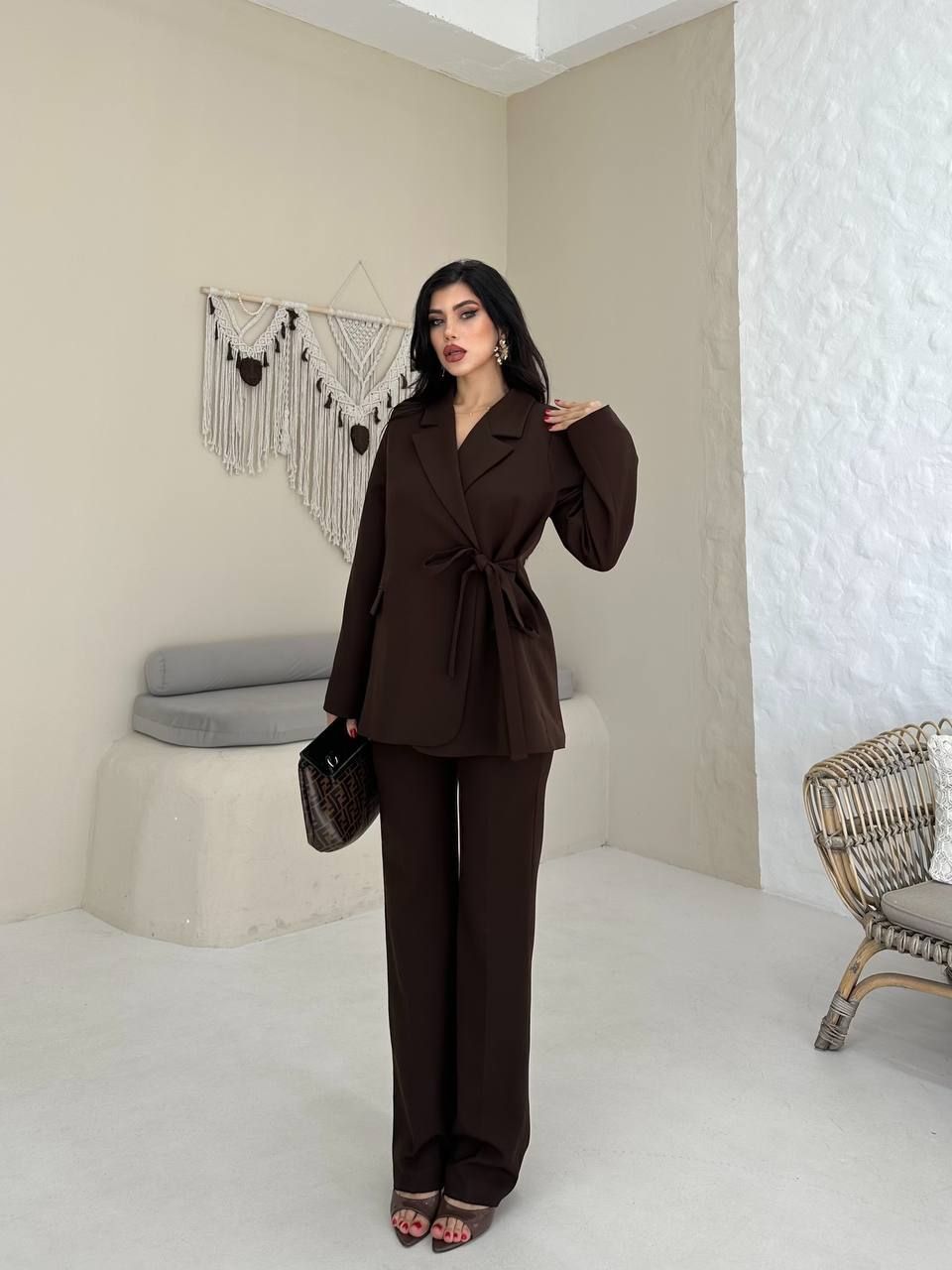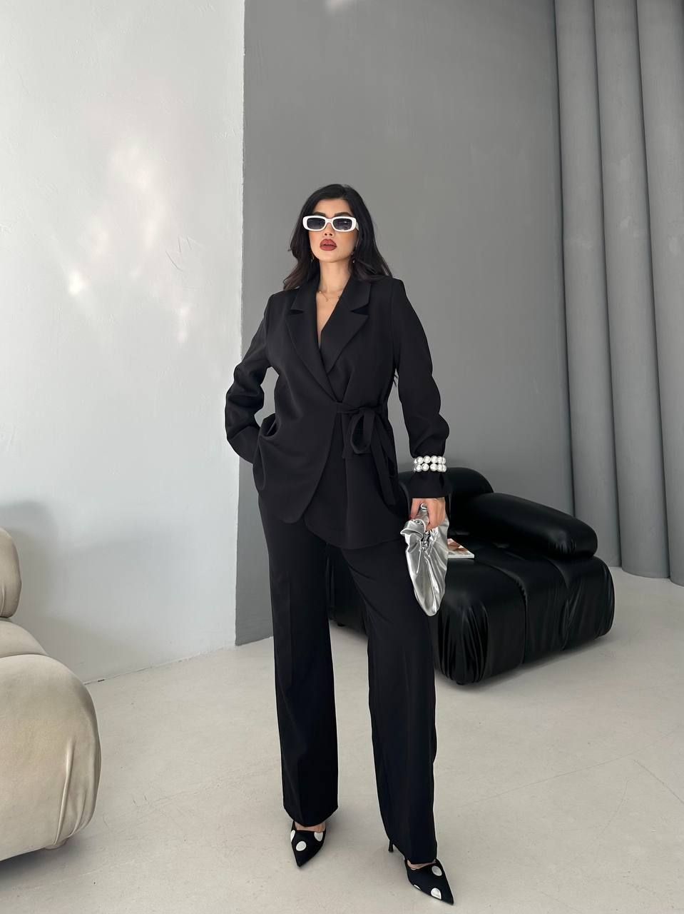 Un ensemble tailleur raffiné qui incarne l’élégance moderne. Sa coupe structurée et sa ceinture nouée à la taille offrent une silhouette féminine et affirmée, parfaite pour le bureau comme pour les occasions spéciales.